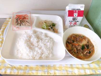 今日の給食は、「マーボーはるさめ、チンゲンサイともやしの甘酢あえ、アーモンドフィッシュ、ごはん、牛乳」です。