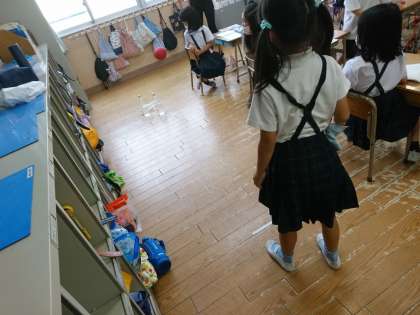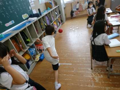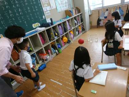 ボールを転がして、ペットボトルが倒れた数と残りの数を考えました。