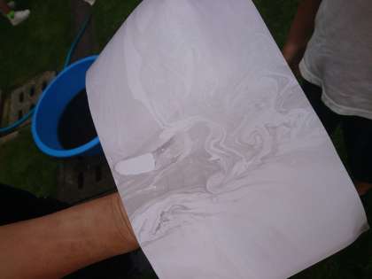 墨流し2年 公開日 2021/08/27 更新日 2021/09/02 2年 画用紙を薄い墨に浸すと、紙の上で墨が流れて綺麗な模様になりました。 乾いたら、この上に好きな色のはんこを押すそうです。 楽しみですね。 いいね(0)