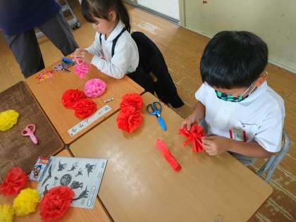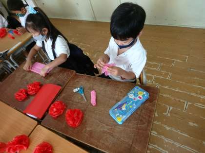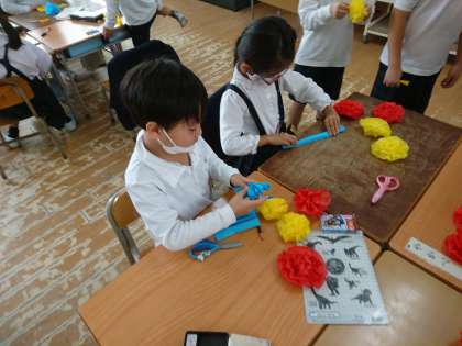 紙を折って花飾りを作りました。 これが集まってお祝いの掲示になるようで、楽しみです。