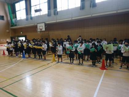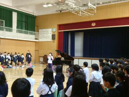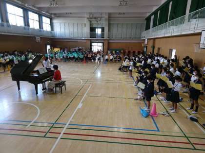 100周年式典で歌う、旧校歌やつるまち子どもの歌などを練習しました。慣れた歌ではありませんが、元気に歌っていました。