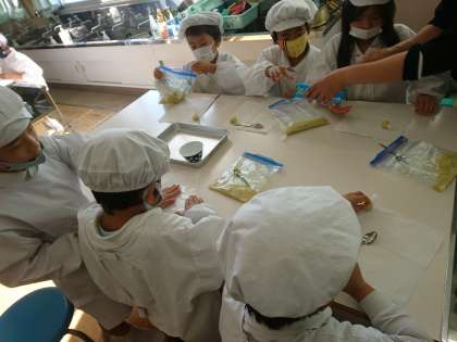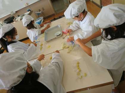 ゆでたお芋をつぶして、茶巾しぼりを作りました。