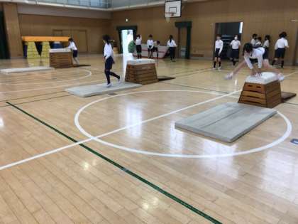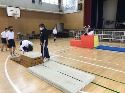 4年生の体育はマット運動です。開脚跳びと台上前転の練習をしています。上手にとび箱の上で回っていました。