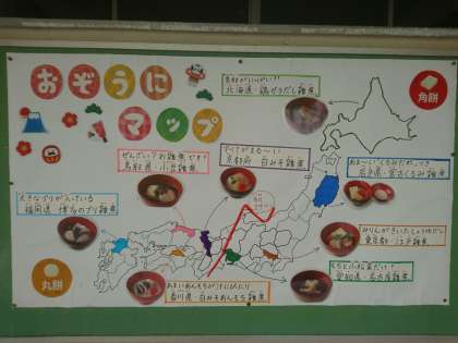 給食室前に、職員の力作「おぞうにマップ」が掲示されています。