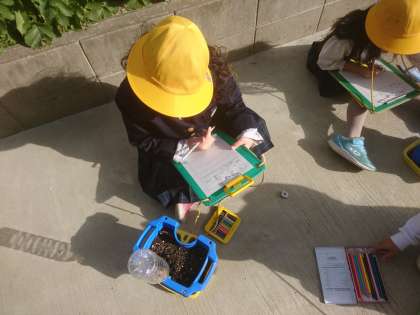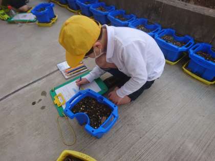 チューリップが芽を出しました。 しっかり観察して、成長のようすを記録していました。