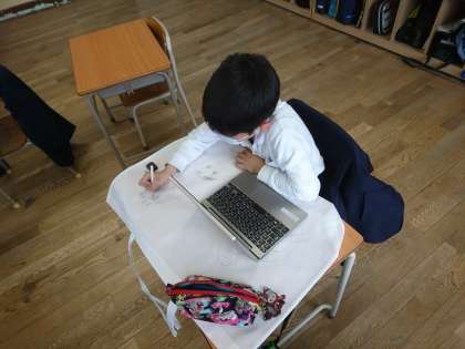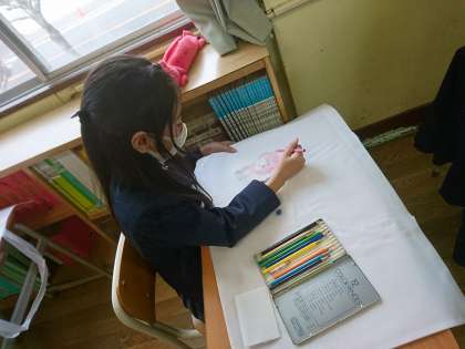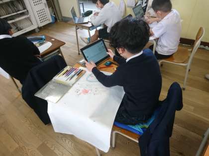 作品袋に絵を描いています。タブレットで絵の見本を探している子もいました。