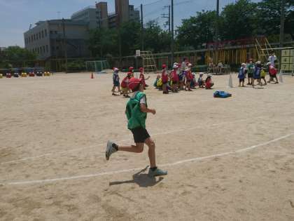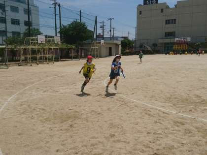 リレーの学習です。 バトンをしっかりつないで、チーム一丸となってがんばっていました。