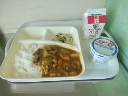 カレーライスは大豆のほくほく感、じゃがいものゴロゴロ感がしっかり残っていて、食べごたえがありとてもおいしいです。