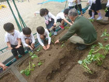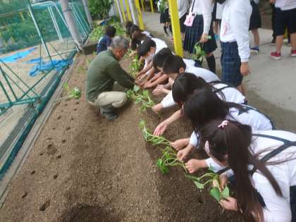 1,2年生が地域の方と一緒にさつまいもを植えました。
