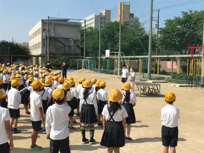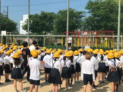 昨晩は大雨でしたが、今朝は運動場もしっかりと乾き、朝会をしました。