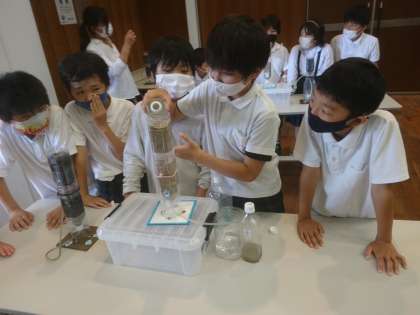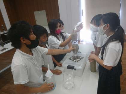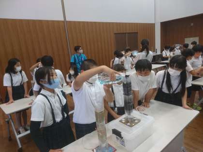 水をきれいにするしくみを、実験しながら学習しています。