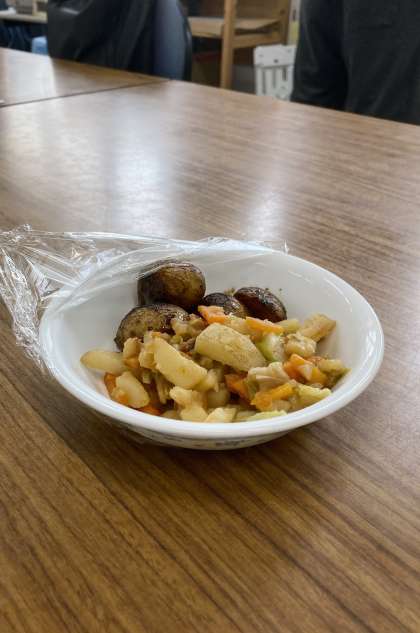 ジャガイモ、ニンジン、キャベツ、ピーマンを食材に適した切り方をし、熱の入りやすさの順序を考えながらフライパンに投入しました。