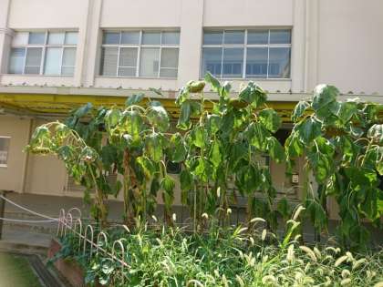 あまりの暑さに、ヒマワリも疲れぎみです。
