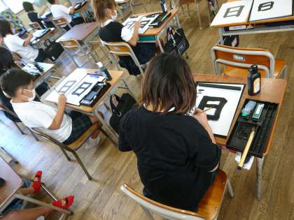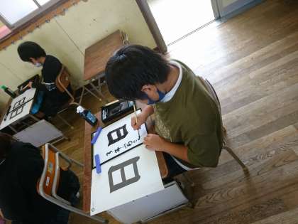 毛筆で「日」を書きました。 「折れ」に気をつけながら集中して書いていました。