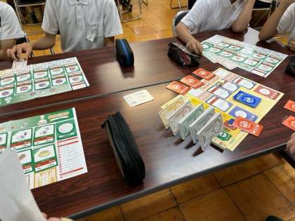みんなでカードゲームをしながら、学習しています。