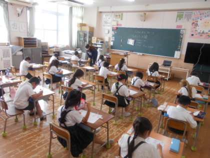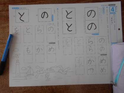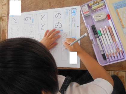 1年1組では書写の時間に、「まがり」のあるひらがなを練習しました。「の」「と」「ら」「を」など、児童にとって「まがり」の部分は書きにくいようです。それでも、手本を見ながら一所懸命練習していました。