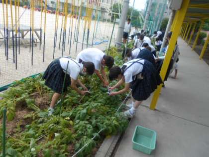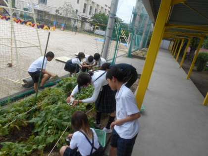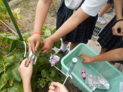 6年生は理科で光合成を調べる実験をしていました。ジャガイモの葉をアルミホイルで覆います。1日経ってアルミホイルで覆った葉と、覆っていない葉とで、でんぷん量を調べます。明日、晴れるでしょうか。