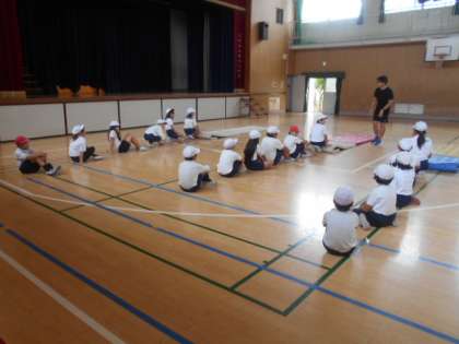 4年生はマット運動に取り組んでいます。前転の練習をしています。簡単そうに見えますが、手のつき方、首の入れ方、技が終わった後の姿勢など、いくつもチェックポイントがあるので、何度も確認しながら繰り返し練習していました。