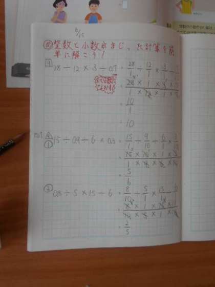 整数と小数が混じった計算 公開日 2023/06/15 更新日 2023/06/15 お知らせ 6年生では算数科で、整数と小数が混じった計算について考えていました。「28÷12×3÷0.7」を簡単に解くには……。 どうも、すべて分数にすると計算しやすいようです。分数の計算は、みんなかなり慣れてきたみたいです。 いいね(0)