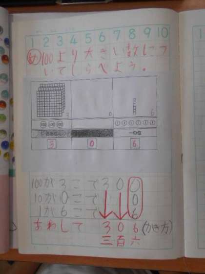 2年生は算数科で「100より 大きい かず」を学習していました。「百のまとまりが3つ、一が6つ」を数字で表すときに、十の位は空位なので「0」と書くので「306」となります。では、漢字で書くときには「三百0六」でいいでしょうか?