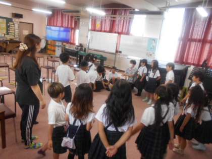 そして、輪になって、先生が野菜の名前を言って右隣りの人へタッチ。次の人も野菜の名前を言って次の人へタッチ。1周すると大きな拍手が起こりました。