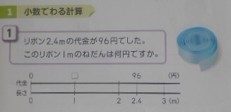 小数でわる計算の仕方を考えよう 公開日 2023/06/20 更新日 2023/06/20 お知らせ 5年2組では算数科で次のような問題について考えていました。まず式を立てなければいけませんが、どんな式になるのか少々悩ましいようです。96円のリボンが「2.4m」ではなく、「2m」なら式を悩まずに立てられます。このあと小数でわる計算の仕方について考えました。 いいね(0)