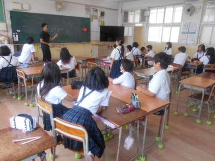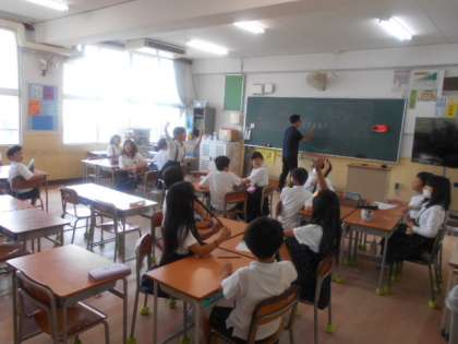 4年1組では学級活動の時間に「少数派ゲーム」をしていました。先生から「行くなら『過去』?『未来』?」「早く『大人』になりたい?それとも『子ども』のまま?」と尋ねられ、班で相談して答えます。意見が少なかった方を答えた班に点数が入ります。難題ですが、班で相談することで親睦が深まっていったようです。