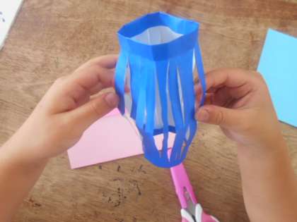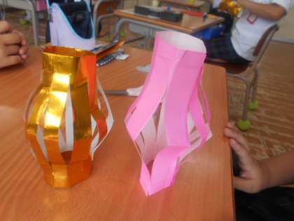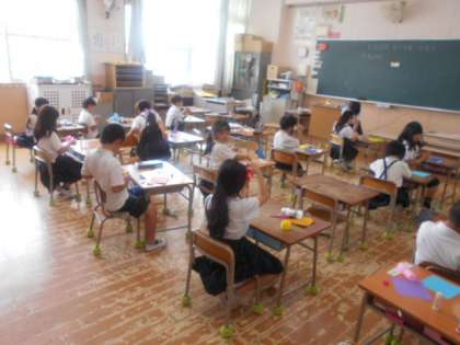 1年1組では図画工作科「七夕の飾り作り」をしていました。折り紙を二つ折りにして、はさみで切り込みを入れていきます。あっという間に、きれいなちょうちんができ上がりました。できた児童は席を移動して、お友だちを手助けします。次はどんな飾りを作るのでしょうか。