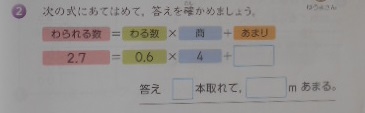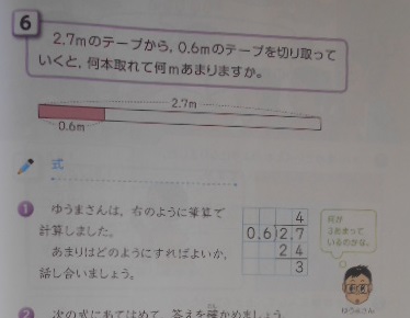 小数で割るわり算のあまり 公開日 2023/06/29 更新日 2023/06/29 お知らせ 5年1組は算数科で、次のような問題を解いていました。「2.7÷0.6」の小数点を移動して、「27÷6」で計算をしてみると、……。「答え4、あまり『3』」? たしかめをしてみると、「0.6×4+3=5.4」???どこで間違えたのでしょうか? いいね(0)