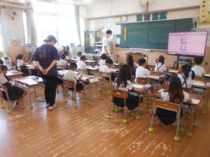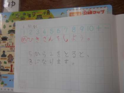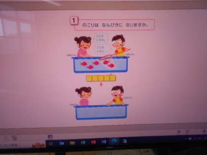1年2組では算数科で「ひき算」に取り組んでいます。次のような絵や問題文を読んで式を立てます。先生が黒板に「□から□をとると、□になります。」と書き、児童はノートへ写しました。□に適切な数字を入れてみると、式が立てやすくなったようです。