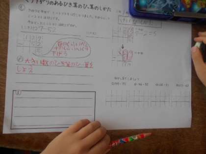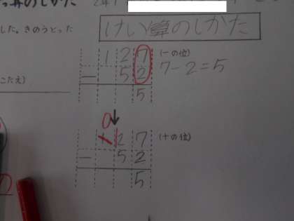 くりさがりのあり引き算 公開日 2023/07/05 更新日 2023/07/05 2年 2年生では算数科で、くりさがりのあるひき算を学習しています。本時では「127−52」を計算します。十の位では「2−5」は引けないので、百の位から繰り下がりします。百の位は「1」から「0」になるので、この「0」はどうしたらいいでしょうか? いいね(0)