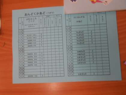 1年1組では音読カードが配られていました。家で、いつ国語の教科書のどこを読むのかが示されています。「まちがえずに」「しせい」など気をつけるめあてをチェックする欄、家の方や先生がサインする欄もあります。毎日忘れずに音読を続けてほしいと思います。