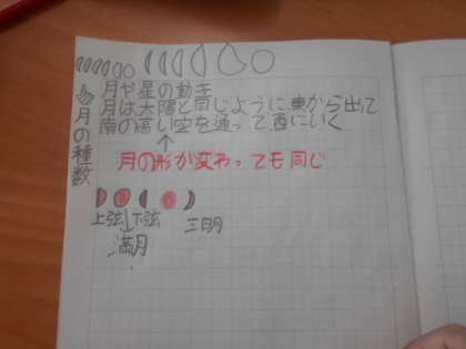 月の動き 公開日 2023/07/05 更新日 2023/07/05 4年 4年1組では理科で、月の動きについて学習していました。月は太陽と同じく、時間とともに東から上って南の高いところを通って西に沈むこと、また、満月・半月・三日月と時期によって形が変わることを学びました。半月は左右どちらが明るいかで「上弦」「下弦」と名称が変わる話になると、児童はなぜか嬉しそうでした。あるアニメの登場人物のようです。 いいね(0)