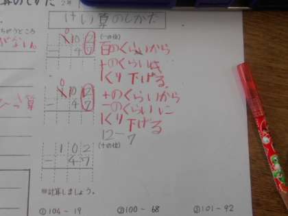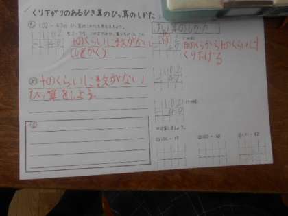 十の位に数がないとき 公開日 2023/07/05 更新日 2023/07/05 2年 2年生では算数科で、十の位に数がないときの筆算の仕方について学習していました。「102−47」「一の位『2−7』は引けないので……。」よく見ると、あれっ、いつもならここで十の位からくり下がるのですが、十の位が「0」で、さあ困りました。 百の位からくり下がるようですが、いくつも気をつけなければいけないことがありそうです。 いいね(0)