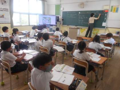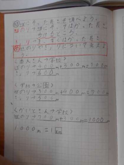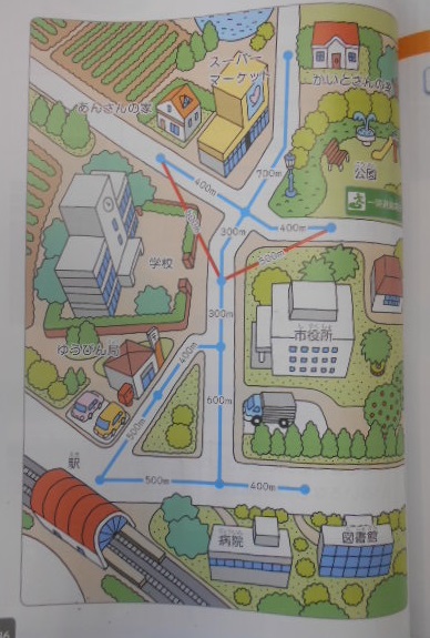 3年2組では算数科で「道のり」や「きょり」について学習していました。絵地図を見て、あんさんの家から学校までの「道のり」と「きょり」を求めます。道のりと距離の違い、理解できたでしょうか。