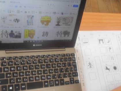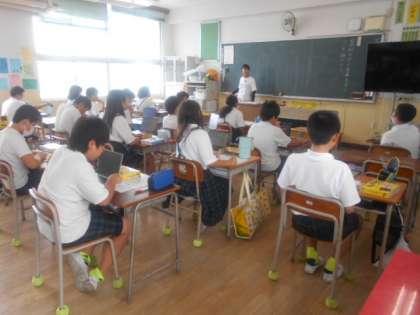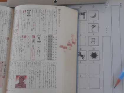 5年生は国語科で、象形文字と指事文字について学習していました。ワークシートが配られ、各自で漢字辞典とタブレットを用意していました。ワークシートに「月」の漢字が載っているのを見つけて、待っている間に字典で「月」を調べたり、タブレットで象形文字について調べたり、児童のやる気を感じました。