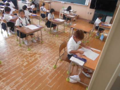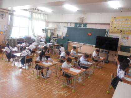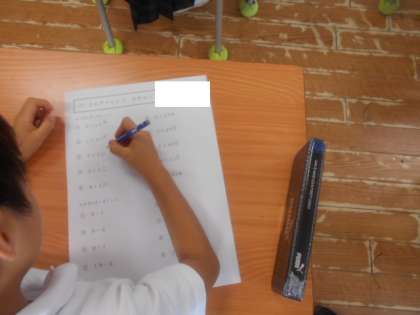 7月10日(月)計算チャレンジを実施しました。写真は1年生が取り組んでいる様子です。1枚のプリントに、たし算とひき算、2種類の計算式が載っています。落ち着いて解いてほしいと思います。