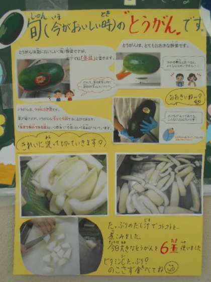 今日の給食 公開日 2023/07/11 更新日 2023/07/11 その他 今日の給食に登場する「冬瓜(とうがん)」は、夏が旬の野菜。 とうがんの煮物は、トロトロに煮込まれていながらも型くずれしておらず、しょうがの風味が効いていてとてもおいしいです。 さけのつけやきは、しょうゆ味がしっかりしていて、ごはんが進みます。 みそ汁は野菜がたっぷりで、暑さで疲れた体に栄養が染み渡っていくようです。 今日もごちそうさまでした。 いいね(0)