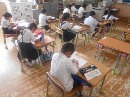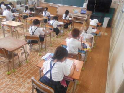 1年1組では算数科「のこりは いくつ ちがいは いくつ」のテストをしていました。「のこりは いくつ ですか。」「ちがいは なんひき ですか。」「どちらが なんこ おおいですか。」など、問題をよく読んで正しく答えなければいけない難問がありますが、がんばって取り組んでいました。