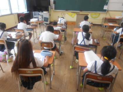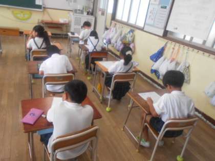 3年2組では算数科「長さ」テストに取り組んでいました。「1km600m=(  )m」など、単位の換算の問題が難しいですが、粘り強く考えてほしいと思います。「あなたの家から1kmくらいの道のりを歩くと、何があるか書きましょう。」という最終問題がありました。「1km」を実感できるでしょうか。