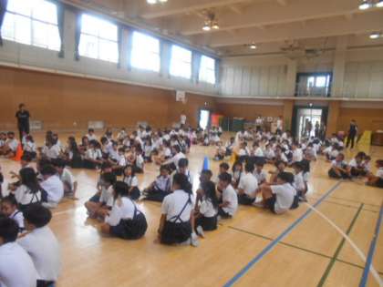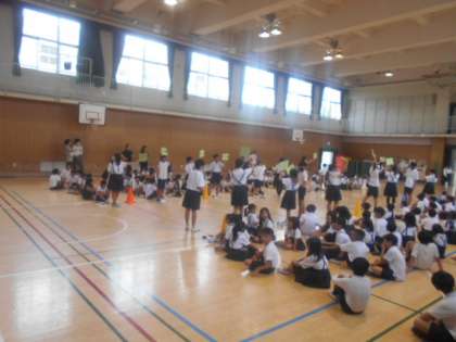 帽子・コーン・ランドセル、いろいろな品物が移動します。最後は人間まで飛んでいました。全問正解の班が多く、みんなしっかり見ていると感心しました。集会委員の皆さん、楽しいクイズをありがとうございました。