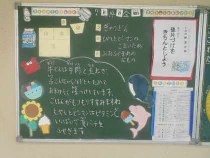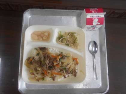 7月14日(金)の給食は、牛丼・牛乳・もやしとピーマンのごま炒め・大福豆の煮ものです。たくさんの具を煮込んだツユの旨味を牛肉や玉ねぎがたっぷり吸収して、味わい深い牛丼になっていました。大福豆も、ほのかに甘みの効いただしで軟らかくなるまで煮こまれていておいしかったです。もやしとピーマンのごま炒めは、シャキシャキ感が残るように炒めゴマの味わいをつけていて、野菜が苦手な児童でも食べられるように味つけされていました。