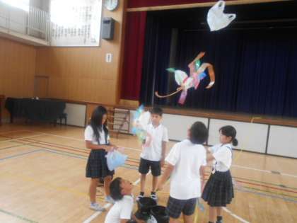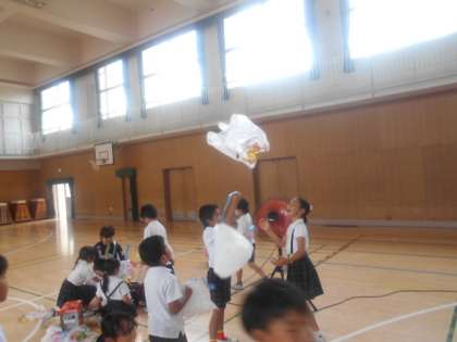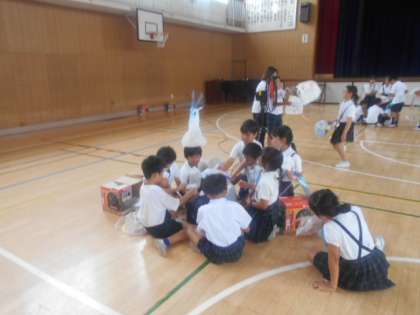 ふき上げる 風にのせて2 公開日 2023/07/14 更新日 2023/07/14 3年 体育館で、大型扇風機を使って、自由に飾りつけしたビニル袋を飛ばしてみます。なかなか風に乗らず苦戦している様子でしたが、何度もチャレンジするたびに風の力にのせるヒントに気づいてきたようです。後半、ビニル袋が高く飛ぶようになってきて、拍手が出だすようになって盛り上がってきました。 いいね(0)