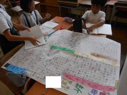 グループで「鶴町新聞」「大阪新聞」「学校新聞」など、それぞれテーマを決めて新聞を作っています。
