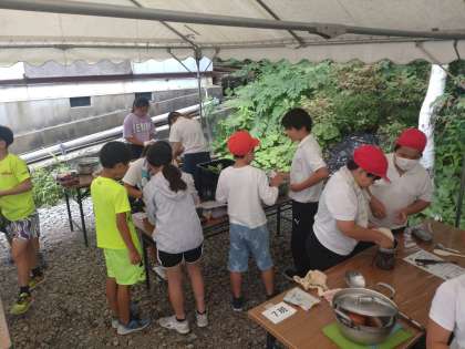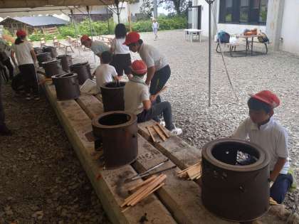 飯盒炊さんが始まりました。火起こし係、飯ごう係、カレー係に分担して、カレーライスを作ります。