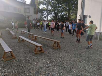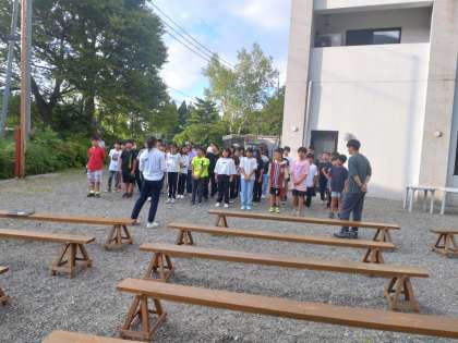 朝の集いで、体操と諸注意がありました。最終日、がんばって楽しみましょう。