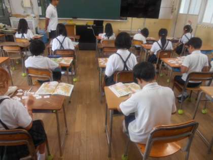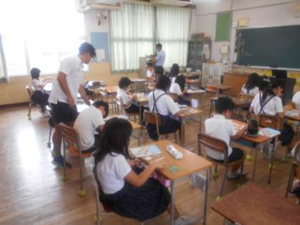 4年2組では外国語活動の時間に、Alphabetの小文字について学習していました。アルファベットのカードを切り取って、教科書を参考にしながら大文字と小文字に分けます。大文字と小文字を正確に読み書きできるようになって、正しく使い分けられるようにがんばってほしいです。