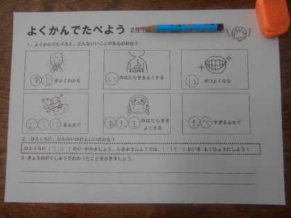 よくかんで食べよう 公開日 2023/08/30 更新日 2023/08/30 2年 2年生は食育の授業で「とくかんで食べよう」に取り組んでいました。よく噛むと、どんないいことがあるのかを考えました。「味がよくわかる」だけでなく「頭のはたらきをよくする」「虫歯を防ぐ」「食べすぎを防ぐ」など多様な良さがあることに気づいていきました。 理想の噛む回数は一口で「30回」だそうですが、食事の時間も考えると一口で「15回」を目標に挙げていました。この後の給食から実践できたでしょうか。 いいね(0)