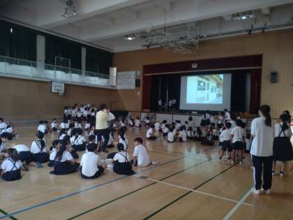 8月31日(木)児童集会がありました。「学校の場所当てクイズ」です。学校のある場所の一部分がスクリーンに映し出されます。それを見て、どこの場所なのかグループで相談します。教室の電灯スイッチ・トイレの記号・音楽室に飾られている作曲家の掲示物・給食室の呼び出しボタンなどがヒントになっていました。