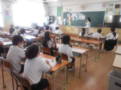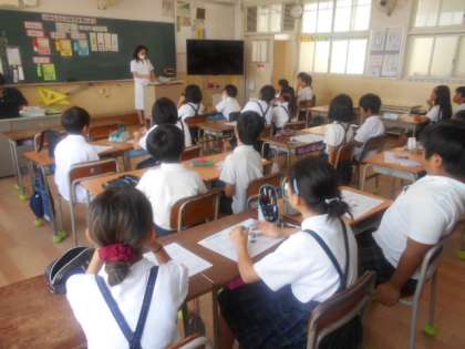 4年1組では食育「飲み物の飲み方を考えよう」に取り組んでいました。まだまだ気温の高い日が続きます。水分補給が大切なことは子どもたちも普段の生活からわかっていますが、「お茶・スポーツ飲料・果汁入り飲料・炭酸飲料」どれを飲んでも同じとはいかないようです。